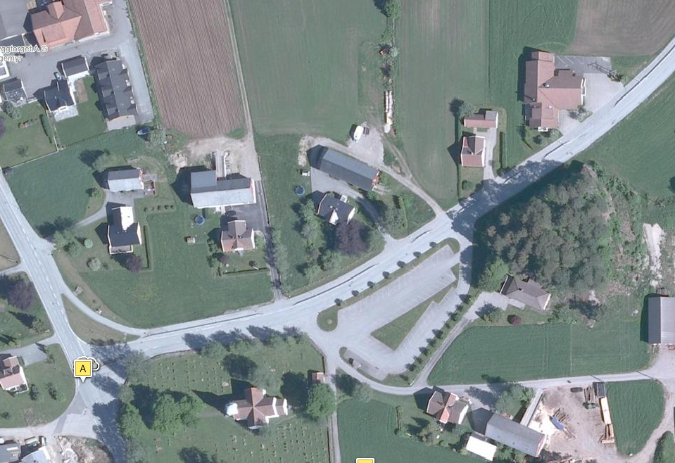 Ta så første vei til høyre og følg veien fram til forsamlingshus på venstre side etter ca. 300 m.
